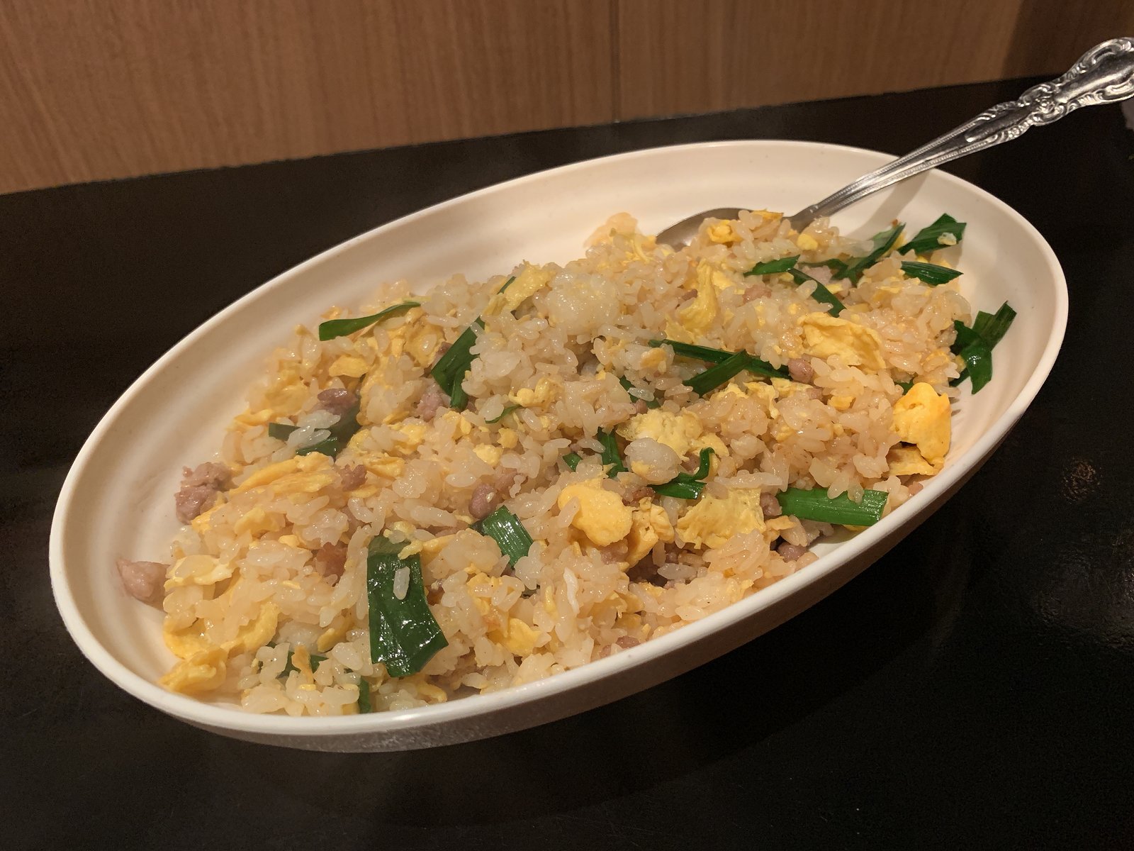 おぉぉ、具が玉子にニラに肉ミンチと、辛麺と一緒で面白い焼き飯だぁ
