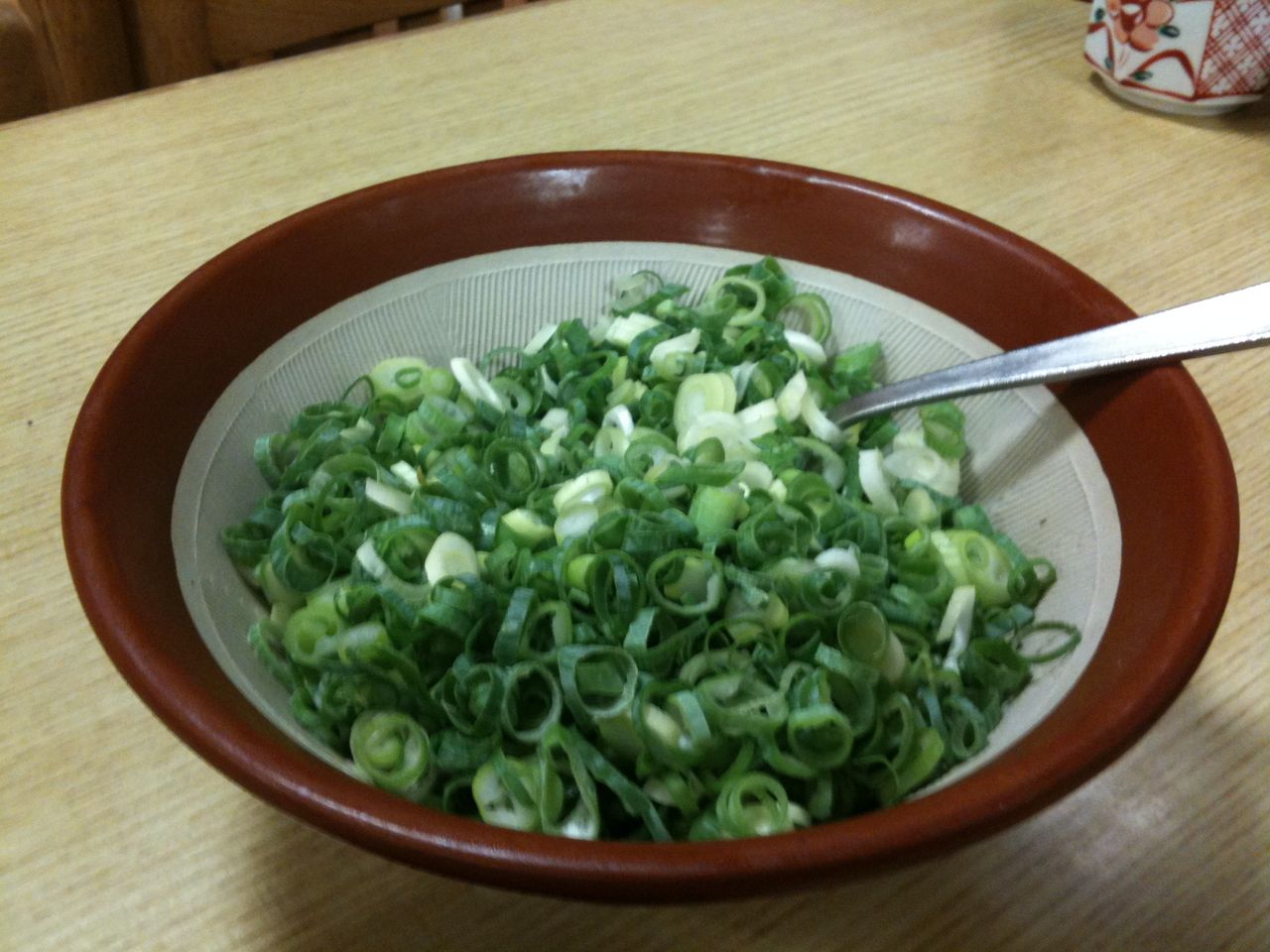 さて、うどんが来たら、テーブルにある入れ放題のネギをもっさり入れましょう、入れすぎたらちと辛みが強くなっちゃうので、そこは自己責任ョ