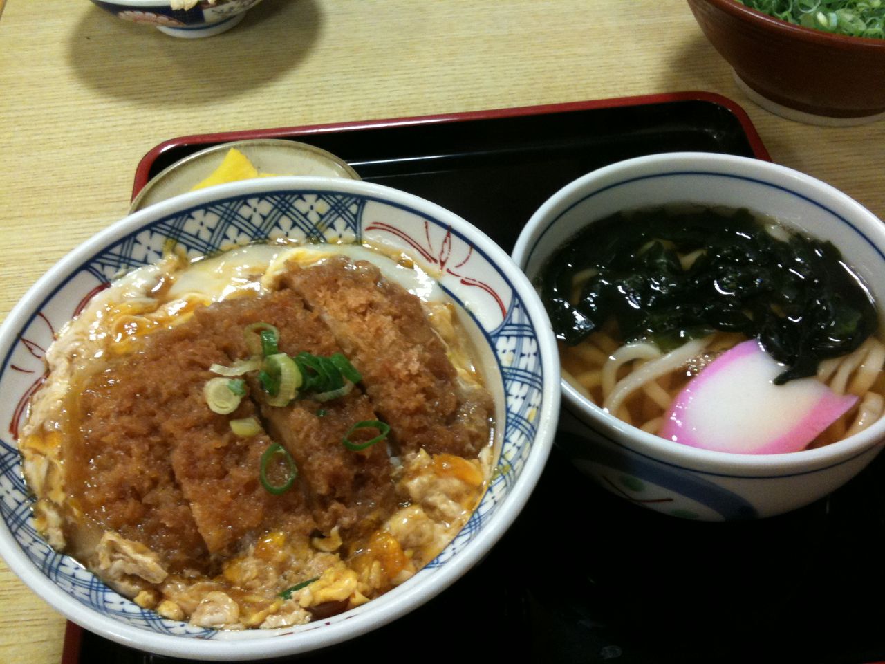 知り合いと行ったときは、カツ丼セット700円と、わかめうどん370円にごぼう天トッピング80円を頼みました