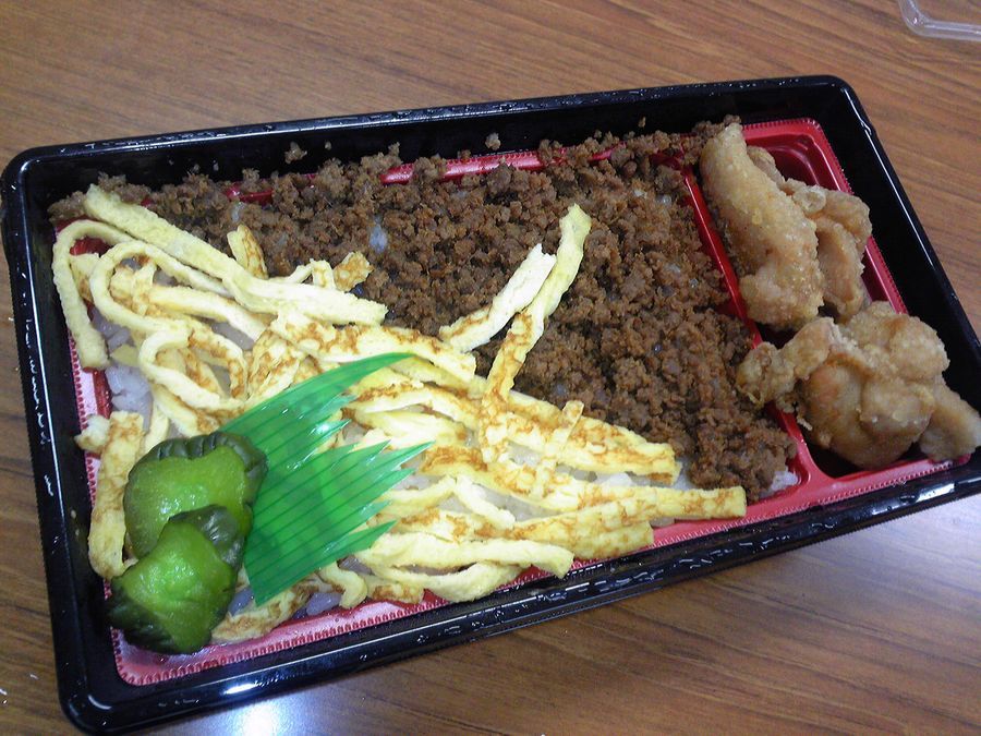 とりそぼろと、太めの錦糸玉子、小さめですがから揚げが二つついています(^O^)