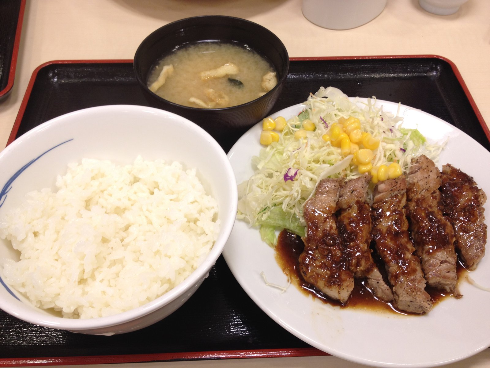松屋さんのホームページから説明をいただきますと、「厚切りで柔らかな豚肩ロースを鉄板で焼き上げ、ガツンとニンニクが効いたステーキソースをかけた、食べごたえのある逸品です」とのこと
