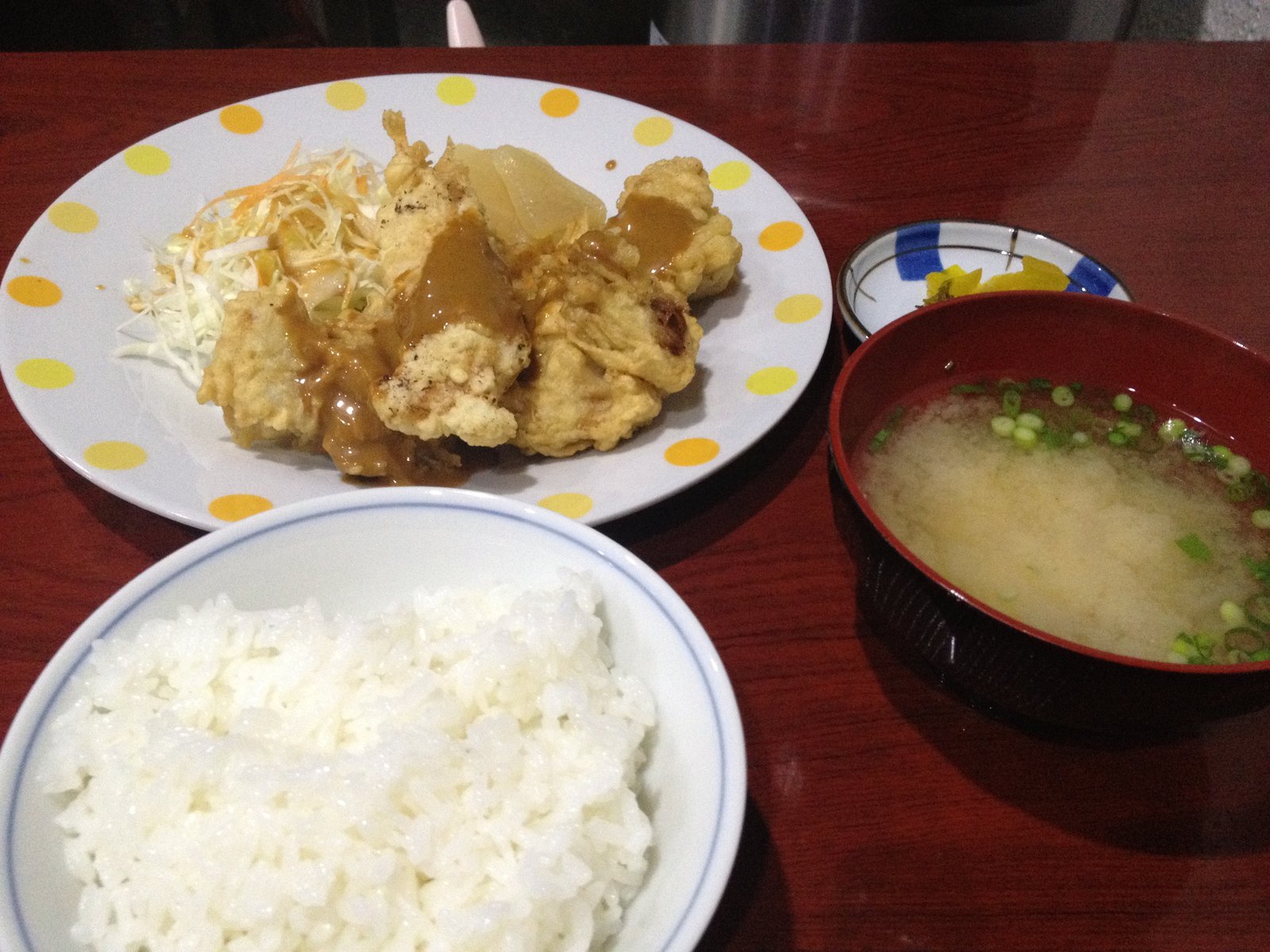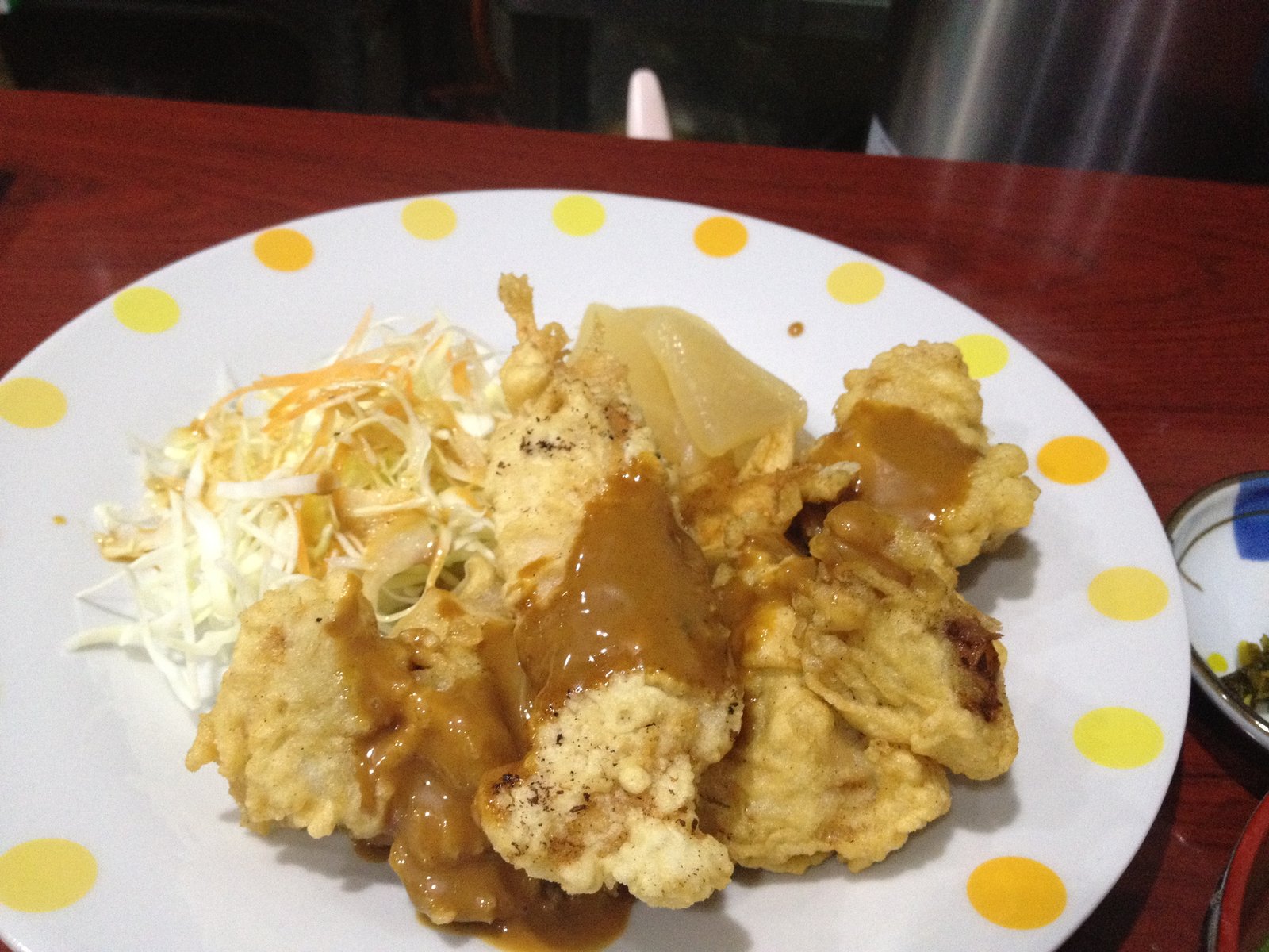 この日はとり天、洋風ソースだったのですが、こちらにもキャベツサラダと副菜が付いているんですね