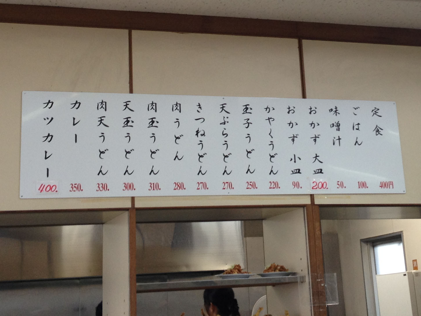 定食400円、かやくうどん220円、カレー350円などが並びます。