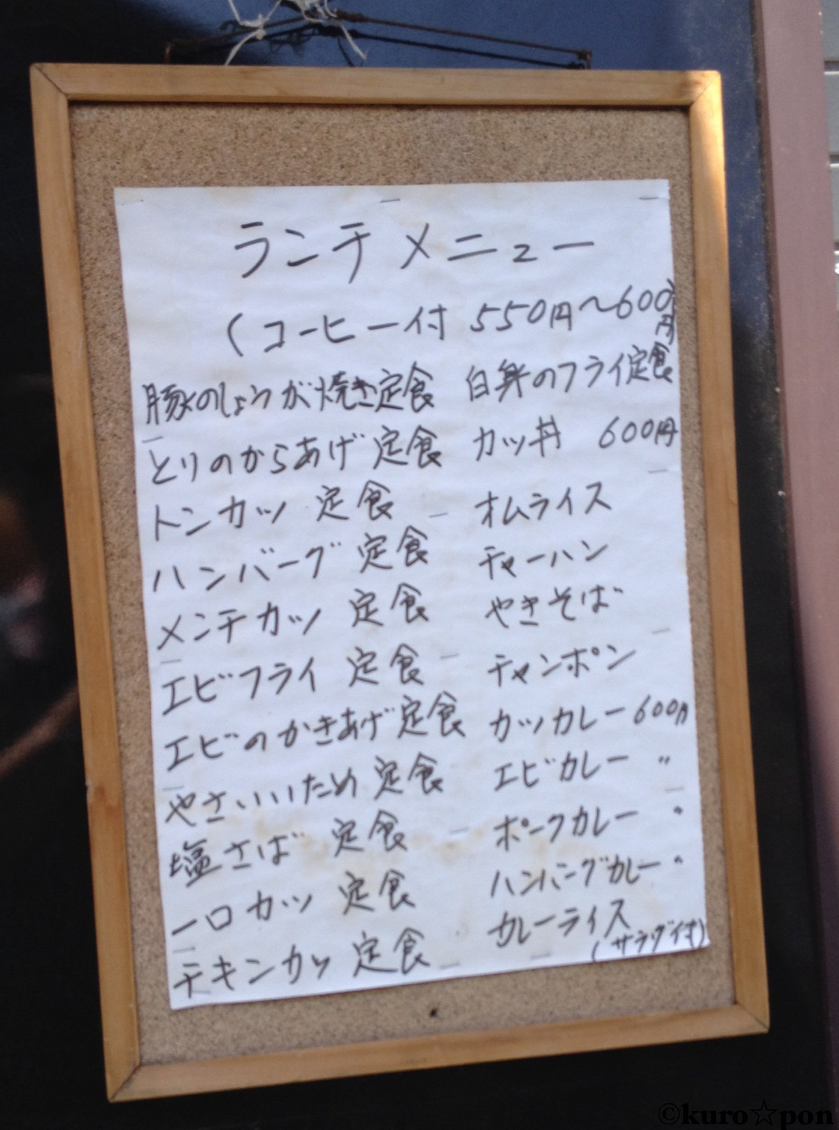 トンカツ定食やハンバーグ定食、やさいいため定食にカツ丼やオムライスなど、550円or600円のお料理が20種類近くあるんですよ~