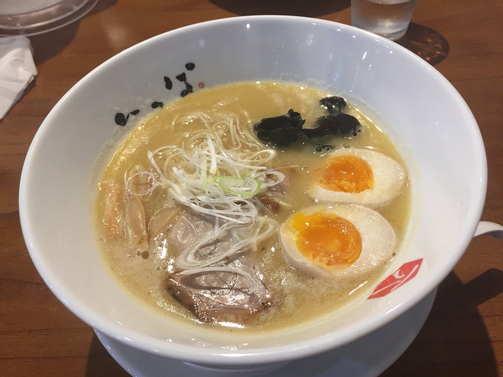 ややとろみのある白湯スープの上には、チャーシューにネギ、メンマ、煮玉子、そしてラーメンの具としては珍しいきくらげが乗っております
