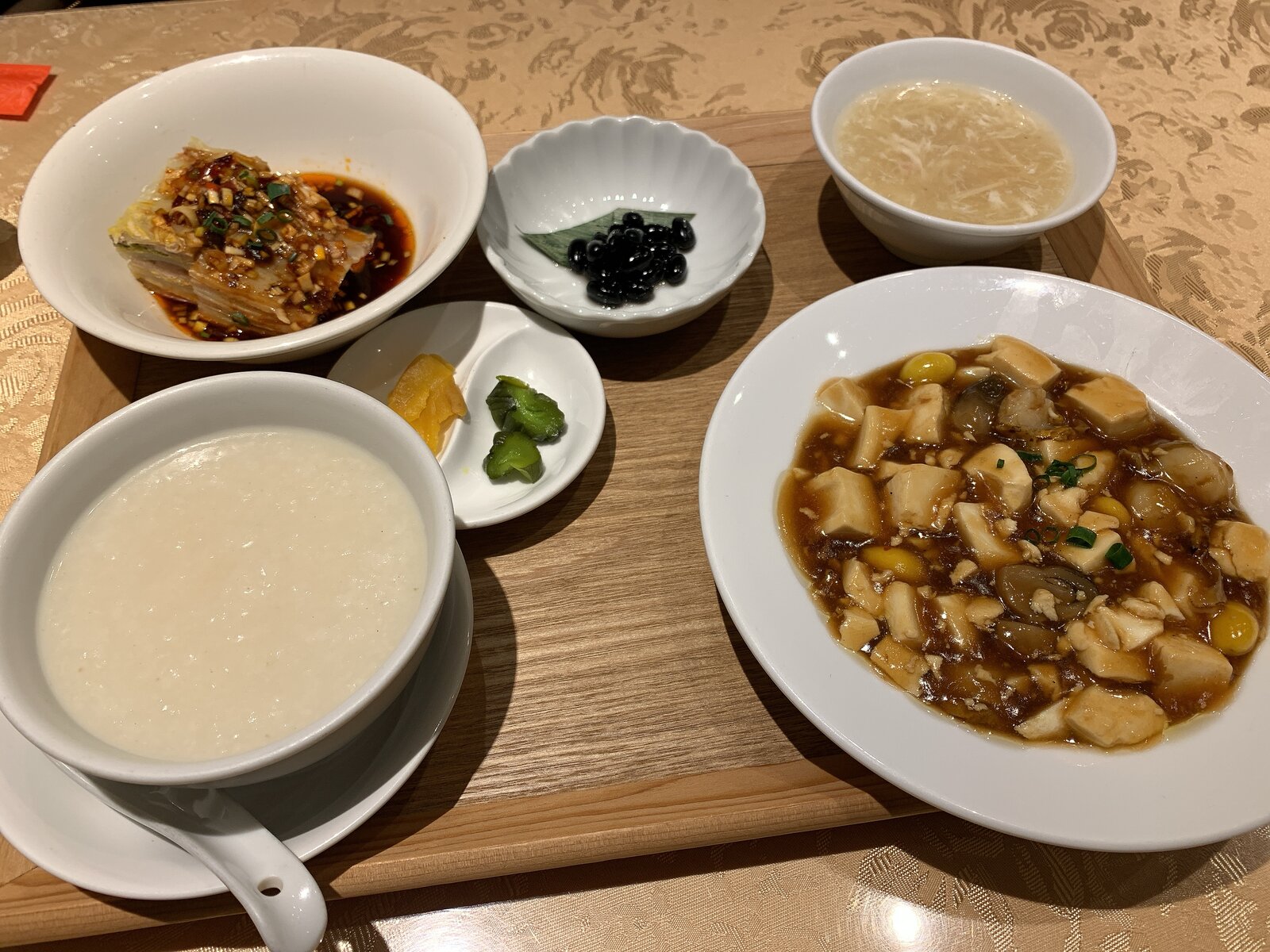 この日は帆立と豆腐の旨煮、豚バラと白菜のミルフィーユ蒸し、ライスorおかゆ、漬物、日替わりスープがついたランチセットでした