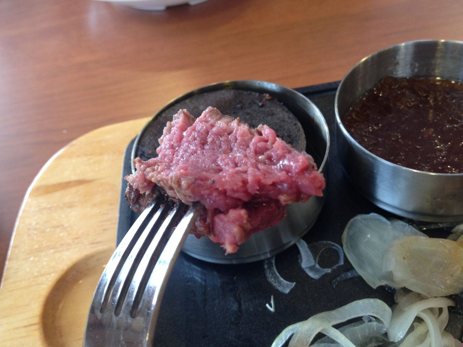 ワイルドステーキは表面だけに焼きが入っておりまして、提供された鉄板を使って自分で火を入れていくのですが、おススメはあまり焼かないことっ(^O^)