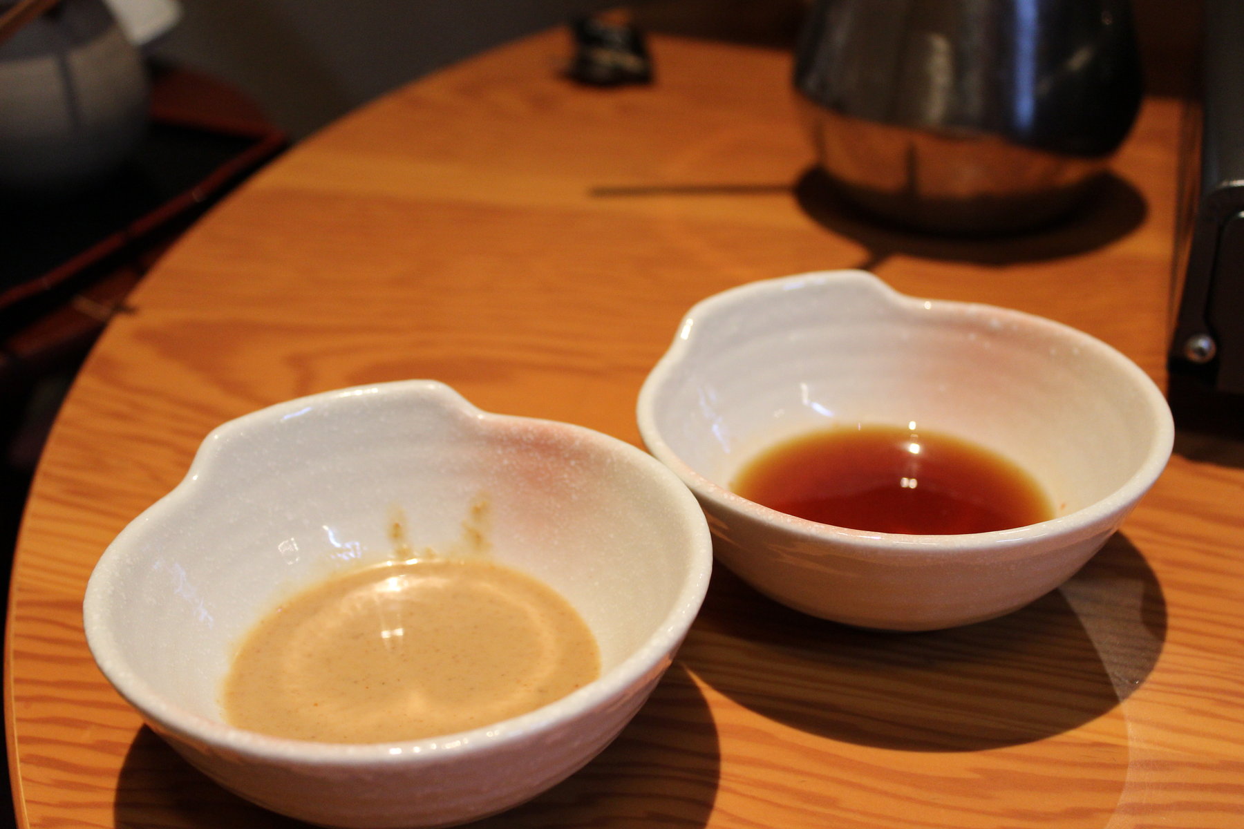 しゃぶしゃぶ用ダシでしゃぶしゃぶしたら、お店特製のポン酢か、ゴマダレでいただきます。