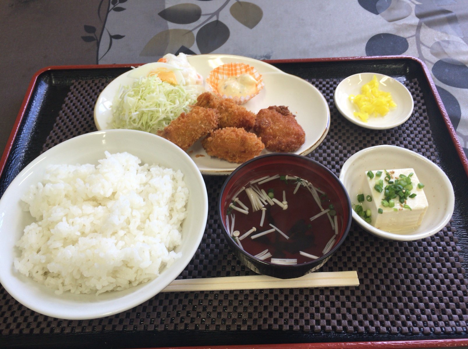 おぉっ、メイン皿には揚げたてのかきフライ3個にフィッシュフライ、キャベツにゆで玉子、ポテトサラダが乗っていて、そのほかご飯にお吸い物、冷奴にお漬物と充実した内容っ